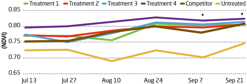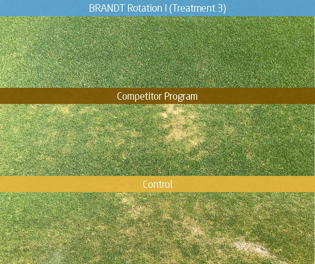 - Furthermore, and for objective quality ratings, GRIGG and BRANDT program tank mixes as well as GRIGG/BRANDT rotational programs (treatments 3 and 4) offered higher NDVI ratings compared the untreated control, including 2 significant dates at the end of the trial (Figure 2)