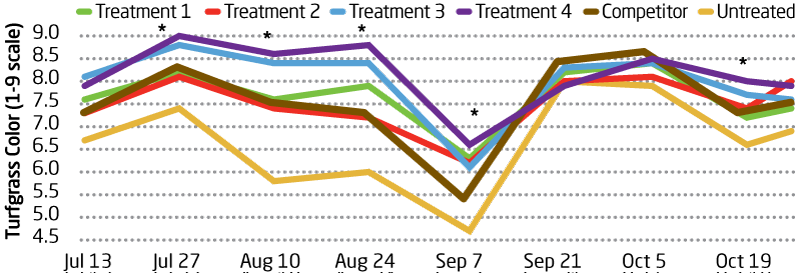 - GRIGG/BRANDT rotational program II (treatment 4) provided significantly better color than competitor treatment and untreated on five (5) rating dates during the trial (Figure 1)